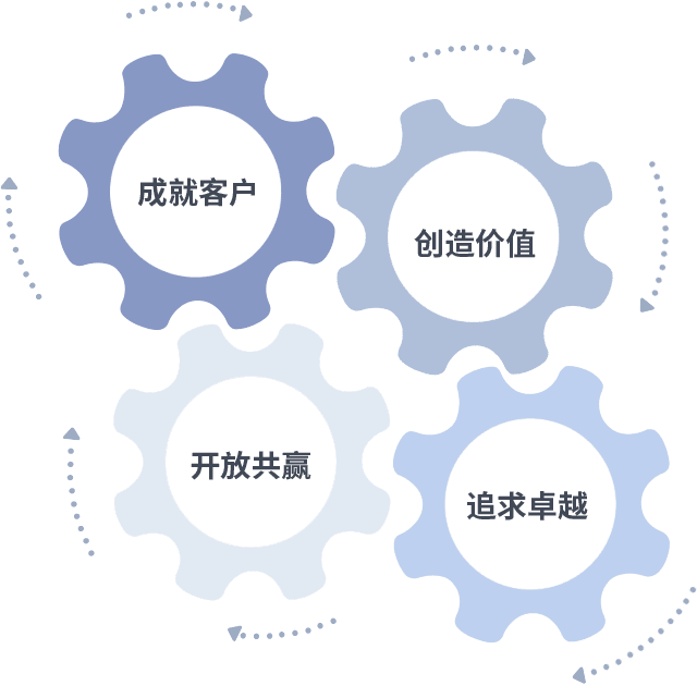 成就客户是一切决策的出发点,,,,创造价值是衡量所有工作的标准,,追求卓越是我们做事做人的态度,,,开放共赢是我们的格局也是最终的结果。。。。价值观的齿轮环环相扣,,推动着组织里的每个人不断向前。。。