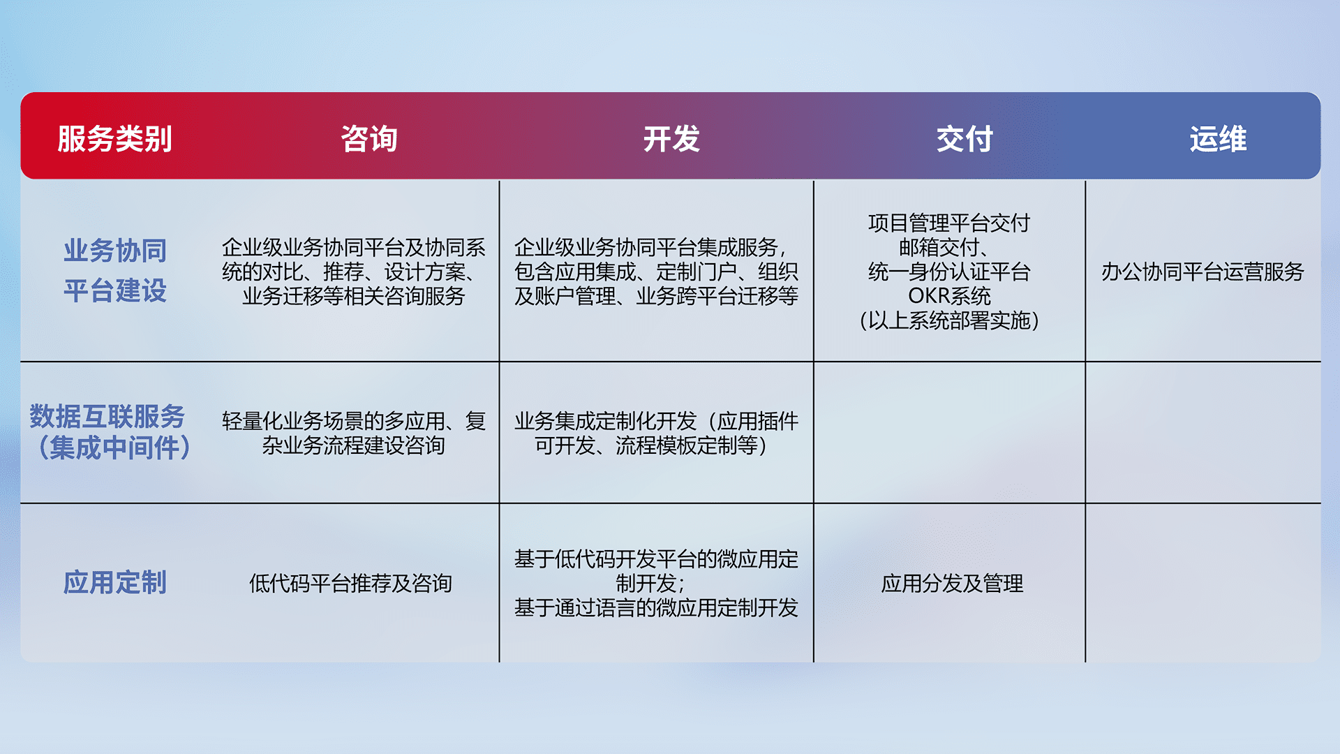针对钉钉、、、、企微、、、IDaas等平台级产品提供产品的规划、、方案、、交付、、、定制化开发等服务,,,实现如统一协同办公、、智能客户服务、、、混合会议管理、、智能数据查询、、、、等业务场景,,,,实现数字化转型。。